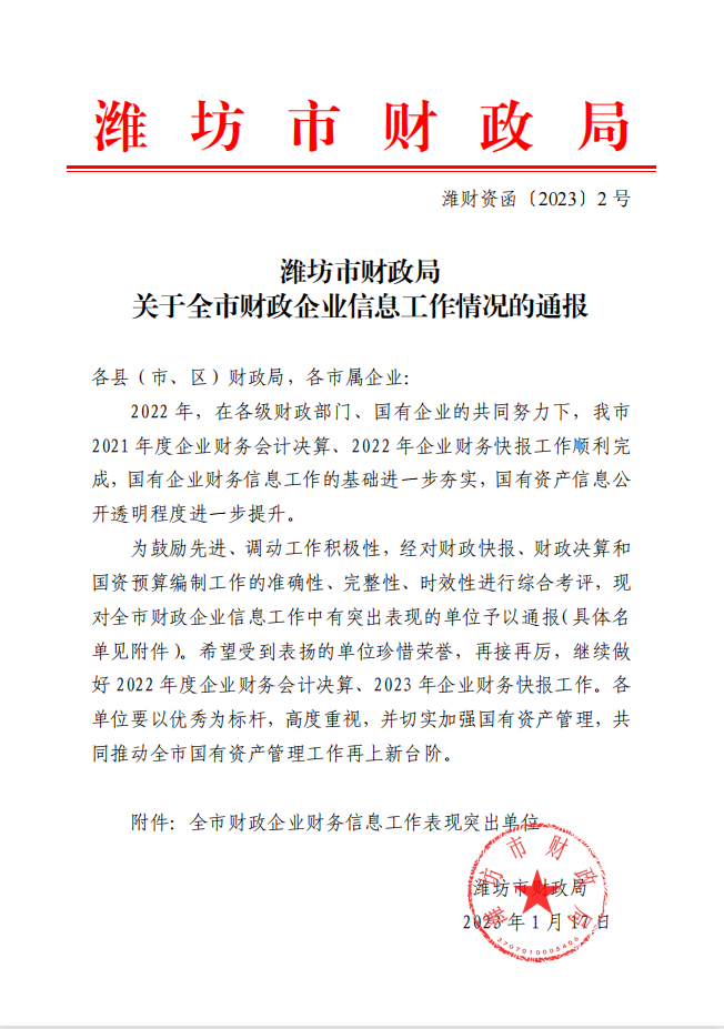 近日,濰坊市財(cái)政局下發(fā)文件,對(duì)全市財(cái)政企業(yè)信息工作情況進(jìn)行通報(bào),我公司榜上有名,連續(xù)兩年被評(píng)為“全市財(cái)政企業(yè)財(cái)務(wù)信息工作表現(xiàn)突出單位”。公司歷來高度重視財(cái)務(wù)管理工作。2022年度一把手親自抓靠,通過會(huì)計(jì)工作數(shù)字化轉(zhuǎn)型、人才隊(duì)伍結(jié)構(gòu)優(yōu)化、會(huì)計(jì)職能